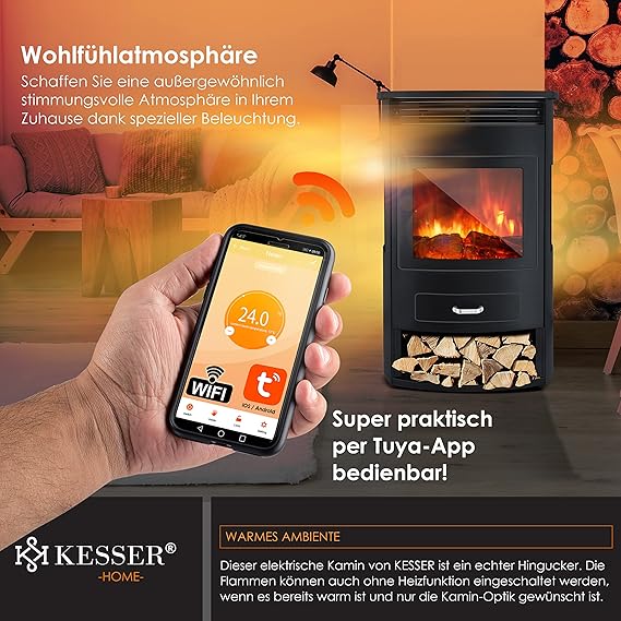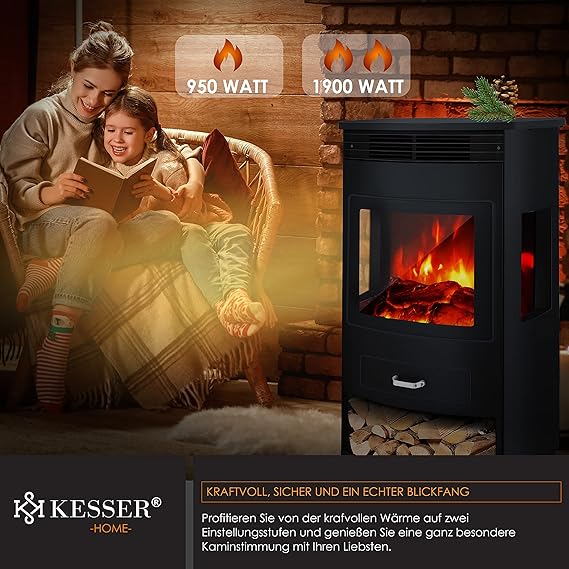 KESSER® Prio Elektrokamin mit Heizung & Fernbedienung, 950/1900W, Realistischer LED-Flammeneffekt, 3-Seiten-Panoramafenster, Thermostat & Timer, Standkamin